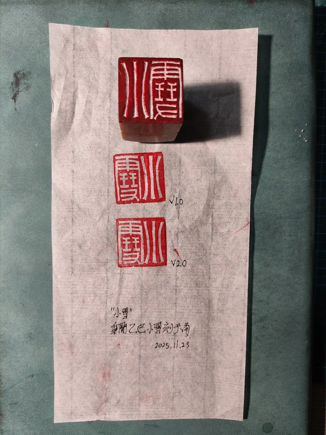 这方印石是之前锯掉印面后的旧印石,砂砾偏多,只能用切刀一点点刻,导致笔画控制较差,尤其是“小”字左右一撇,曲度不一。“雪”字上部分,先刻横,后刻竖,横过长导致竖画与横画连接到一起,不甚合六书意思。下刀不够决绝,流畅性差,反刀与二次修饰过多。