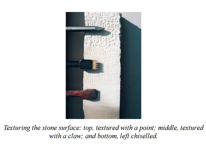 “从一个行程的一端到另一端的雕刻被称为 “经过(‘pass’)”,要雕刻一个完整的 V 形截面,必须在行程的两侧交替经过若干次。用凿子轻轻敲击凿头的规律性动作会在石头上留下一个个小台阶、其规律性将反映出攻丝的规律性。通过小幅度、有规律的连续敲击可以最大限度地控制凿子,每次敲击的距离大约为 10 毫米(3⁄8 英寸)。”