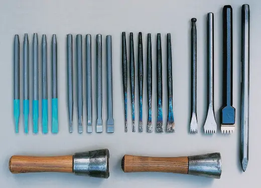 - 凿子。分钢凿与钨凿,前者适合砂岩、石灰岩,后者适合花岗岩、大理石。还有如上图右侧的爪凿,用来给石面上增加质感。